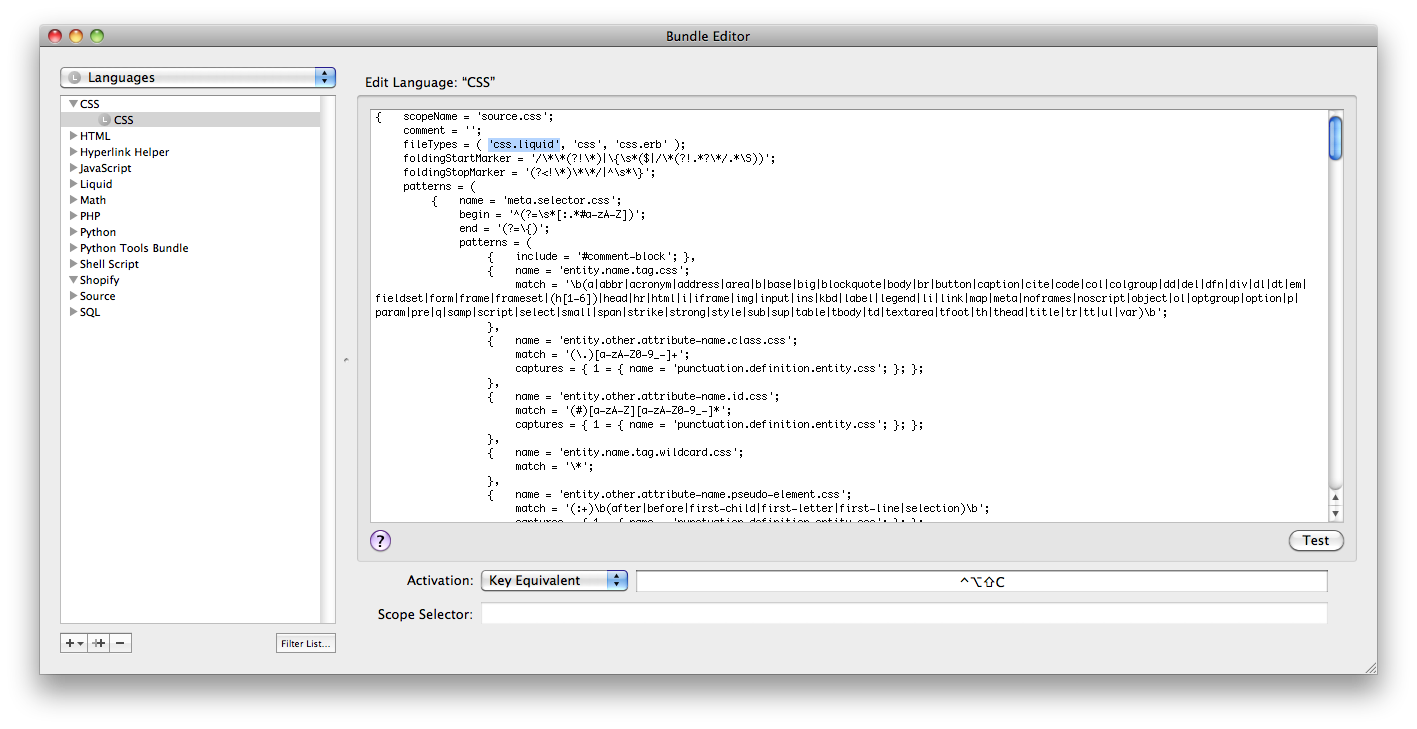 To add css.liquid to the CSS language, push cmd+option+control+L, click on CSS, click on CSS again, and add ‘css.liquid’ to the ‘fileTypes’ line.