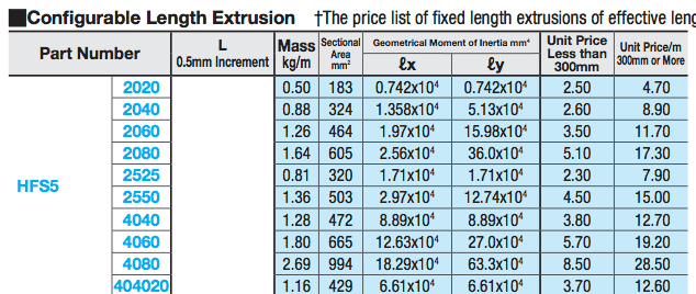 The Moment of Inertia for the two axes are clearly shown. The Modulus of Elasticity is a property of the material, and I couldn’t actually find the exact grade of aluminum Misumi is using, so I looked online for average values and it ranged from 9,000,000 PSI to 11,000,000 PSI.